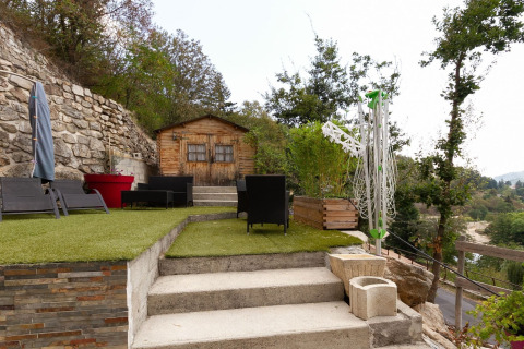 The chalet sits along a quiet country road that used to be a railway line, right next to the peaceful Eyrieux river. Step outside and you’re straight into hiking and cycling territory, with green hills, old railway paths and viewpoints all around you. There’s even a pond nearby where you can swim or cast a fishing line on warm days.