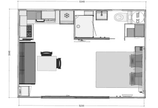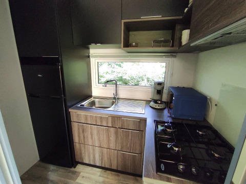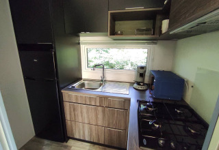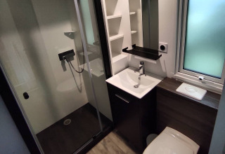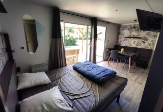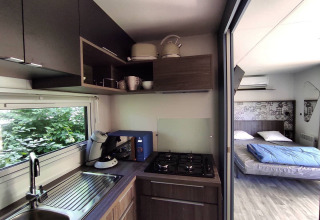 This comfortable mobile home of 20 m² features a bedroom with a 160 cm double bed and a sofa bed in the living area. The accommodation is practically furnished with a kitchenette equipped with hotplates, a microwave, mini-oven, refrigerator with freezer compartment, toaster, kettle, and a Senseo coffee machine. In the living room, you will find a dining table and a flat-screen television. Thanks to the air conditioning and heating, the inside remains pleasant in every season. The bathroom is equipped with a shower, toilet, and a towel radiator.