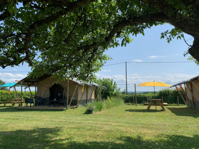 Stay in a safari tent at Minicamping Sous les Cloches, and enjoy a piece of paradise in the heart of France! Take a dip in the outdoor pool, end the day by the campfire or enjoy the beautiful view. Nestled in lush nature, it is the perfect base for exploring picturesque villages, hiking over rolling hills and biking along babbling rivers. Experience the charm of the French countryside at this glamping property!