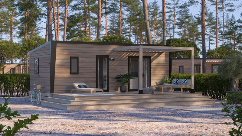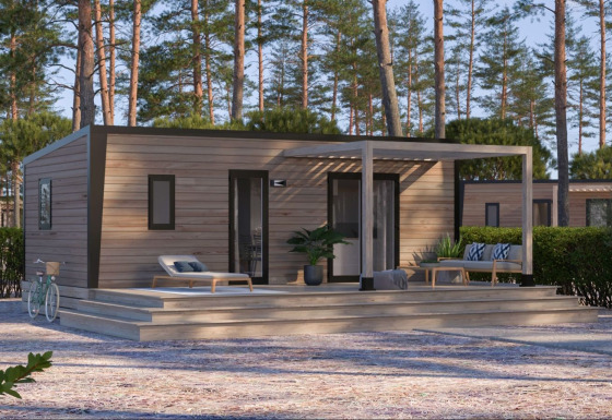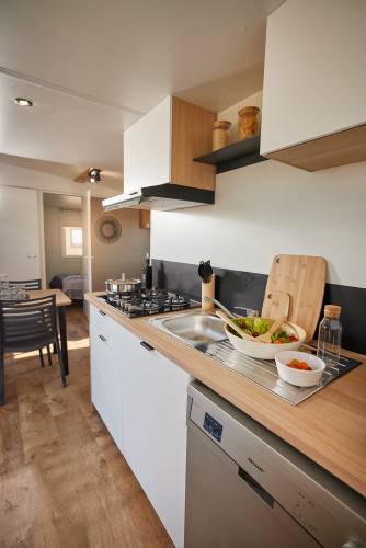 Stacaravan Grand Confort (29m²), with a covered terrace of 15m² equipped with: