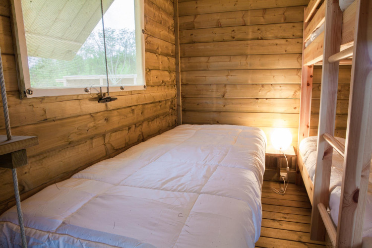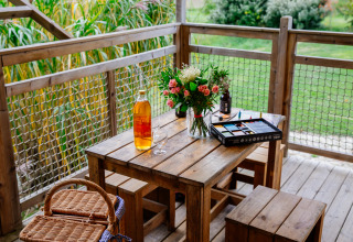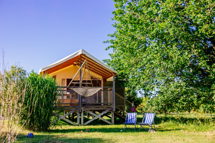 But the real highlight? Outside awaits a spacious terrace with lounge area and hanging net – perfect for relaxing afternoons in the sun. This safari tent is the place for families who love nature, peace, and a unique experience in southwest France.