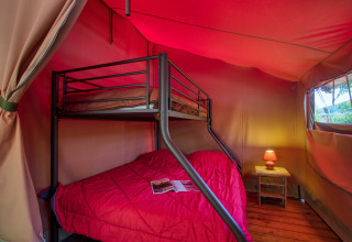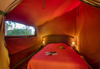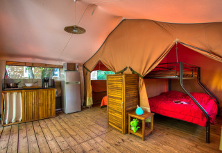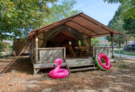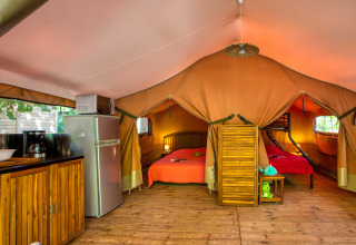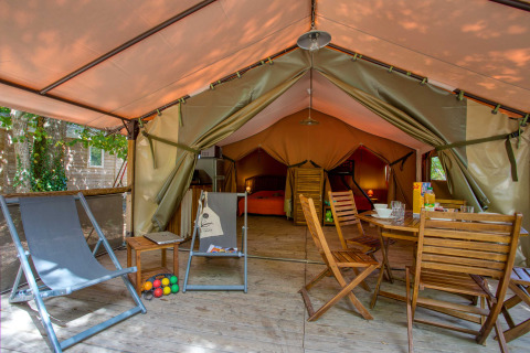 Wooden floor, furnished tent of 40m² with covered terrace of 10m².