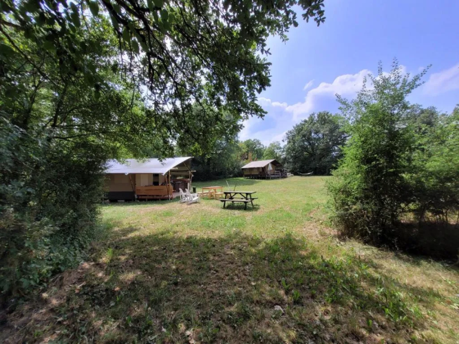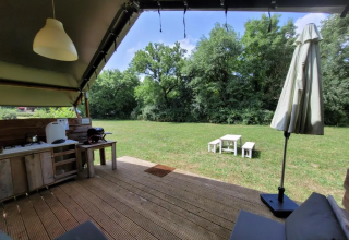 This Safaritent is set on a wooden deck and offers a comfortable glamping experience with plenty of space and privacy. Inside you'll find an atmospheric living area and a fully equipped tent with all the conveniences you need for a relaxing stay. The shared sanitary building is within walking distance.