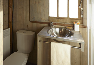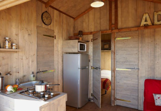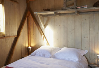 Experience outdoor living in comfort and style in an atmospheric wooden cabin of 38m², elevated on stilts amidst greenery. Enjoy the spacious open living room with television, a fully equipped kitchen, and a private bathroom with shower. On the covered terrace, enjoy your morning coffee while looking out over nature. The hut accommodates four people and has two cozy bedrooms: one with a double bed and one with two single beds. Thanks to the warm wood look and chalet feel, it feels instantly familiar, but with all the comforts of home. Perfect for a relaxing glamping experience, with just that little bit of extra comfort you’re looking for in a unique place to stay.