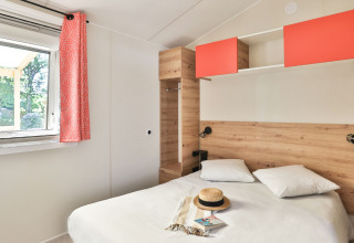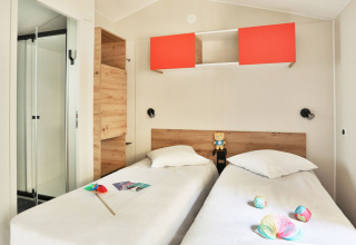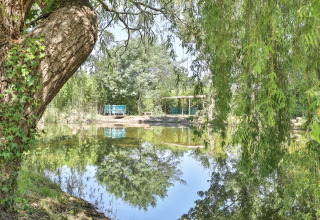 Relax by the edge of a pond, surrounded by greenery and with all luxury within reach: that's the Zen Stacaravan. This premium accommodation offers a unique glamping experience in a peaceful, wooded environment. Inside, you’ll find elegant decor with two comfortable bedrooms, each with its own bathroom for optimal privacy. The kitchen is fully equipped and includes a dishwasher and microwave, among other things. In the cozy living room, there is a television and plenty of space to unwind together after an active day.