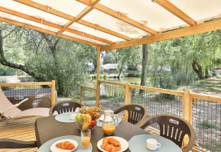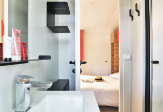 Outside awaits the real eye-catcher: a private jacuzzi on the wooden terrace overlooking the water. Sun loungers, low seating and a plancha ensure long evenings full of relaxation, wellness and togetherness. Whether it’s for a romantic getaway or a luxury family holiday, the Zen Stacaravan offers a refined and comfortable setting in the heart of nature.