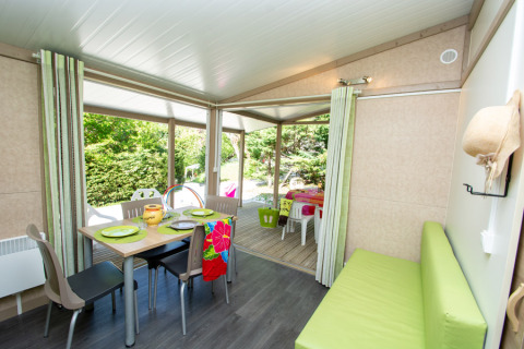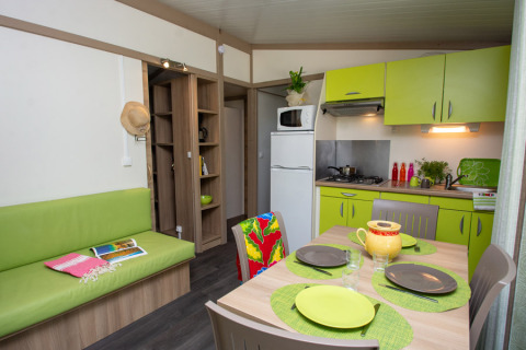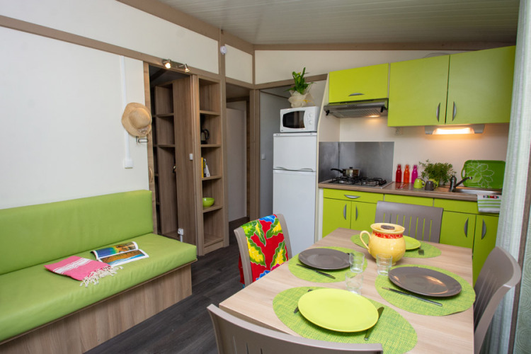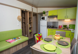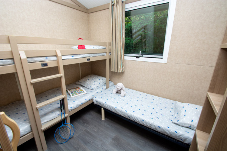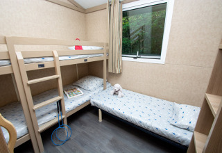 The total area is 28 m². The living area is 11 m² and the terrace measures 12 m². There are two separate bedrooms. One bedroom has a double bed measuring 140 x 190 cm. The second bedroom has three single beds of 80 x 190 cm, consisting of a bunk bed and a pull-out bed. The bunk bed is not suitable for children over 14 years old.