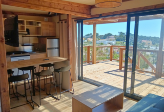 The open kitchen is located in the living area and is fully equipped. There is a kitchenette with crockery and cutlery for the appropriate number of people. The kitchen has hot and cold water, a sink, refrigerator with freezer compartment, dishwasher, four-burner stove, microwave, toaster, kettle and a Nespresso coffee machine.