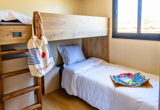 Inside, there are three separate bedrooms. One bedroom has a double bed measuring 160 x 190 cm. The second bedroom is furnished with two single beds measuring 80 x 200 cm. The third bedroom has a bunk bed with two single beds of 80 x 200 cm.