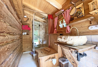 The layout is practical and relaxed, ideal for families or a small group of friends. Children have plenty of space to play, both inside and out, and the bunk bed is guaranteed to be a favourite. The bathroom is accessible from outside, and there’s an additional toilet with urinal, so you won’t be queueing in the mornings. Central wood heating keeps the whole hut pleasantly warm, even in winter.