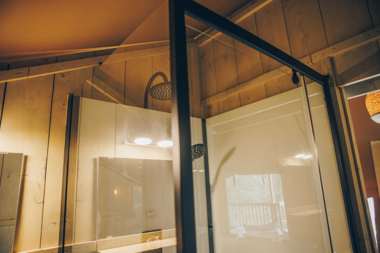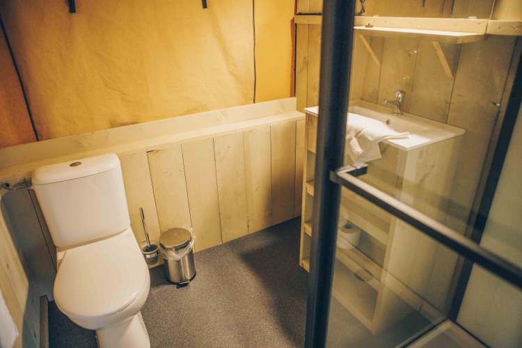 - Each tent has a shower with hot water, sink and toilet.