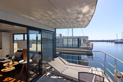 Outside you have two lovely spots to relax together: a cosy terrace at the front and your own private sun deck on top. Start your day with coffee in the fresh sea air, stretch out with a book in the sun or share a drink at sunset while watching the boats in the marina.