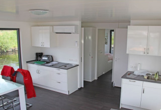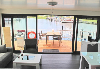 Inside, the houseboat welcomes you with a bright, spacious living area full of natural light thanks to its large windows. From the sofa you can gaze straight out over the harbour and the lagoon landscape. Fish jump, water birds circle and the reflections on the water change throughout the day – it’s the kind of view you never get tired of.