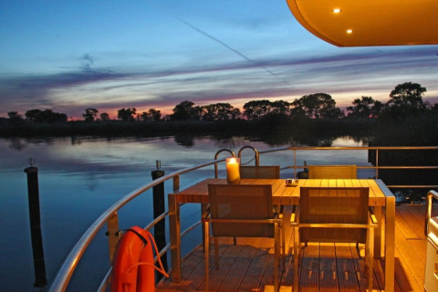 Outside, you can relax on the terrace at the bow or climb up to the roof terrace for even better views. Enjoy your morning coffee in the fresh air, linger over a long sunset drink, or simply stretch out with a good book while boats glide past in the distance.
