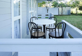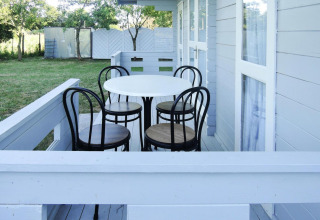 One of the best spots is the private terrace. Start your day here with a quiet breakfast in the fresh air, or end the evening with a drink while the sun sets over the garden. The grounds around the bungalow are beautifully kept, with plenty of green, flowers and space to unwind. It feels like your own little hideaway in nature.