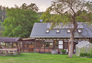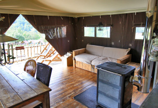 The tent house offers everything you need for a relaxing stay. Inside you will find a spacious living area with a cozy sofa and a large dining table where you can gather with the whole family or friends. Do you hesitate between inside or outside? On the veranda you'll find a lovely sheltered place under the awning, with a picnic table and lounge chairs for relaxing.
