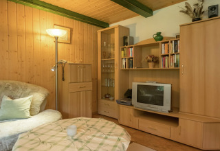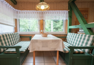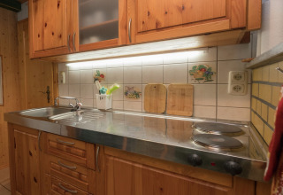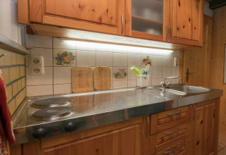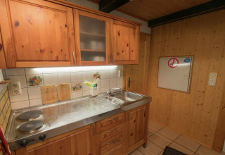 Inside, you’ll find a bright living and dining area where everyone can relax together. Light the wood stove in the evening, curl up on the sofa and enjoy a movie with the DVD player and stereo in the background. The open kitchen is fully equipped with a microwave and coffee machine, so you can easily prepare breakfast or a simple dinner after a day out.