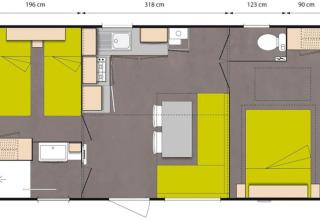 The mobile homes and chalets of the IRM Riviera series are located in a beautiful location on the edge of the forest and offer approximately 29 m² of living space. They feature a double bed (140 x 190 cm) and two single beds (80 x 190 cm each), a living room with separate dining area and kitchen, a shower room and a separate toilet. The kitchen is equipped with a 4-burner gas stove and a 115-liter refrigerator. The wooden terrace in front of the mobile home is furnished with garden chairs, a table and a parasol, ideal for enjoying nature.