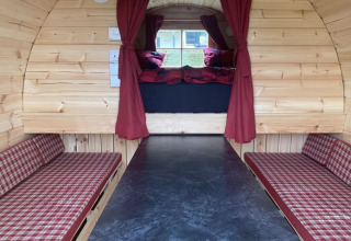 The cozy Finkota barrels, made of natural spruce, are located on the family meadow with a direct view of the lake or in the birch grove right next to the forest. The barrels can accommodate up to 2 adults and 2 children (up to about 12 years old) and are the perfect overnight option for a hiking weekend or a short vacation in nature. Each barrel has a double bed (2x2 meters) and two sofas that can each be converted into small beds 80 cm wide. In front of each barrel is a small terrace with a table, 4 chairs and a parasol. As a guest in a sleeping barrel, you can use the shared bathroom facilities. A fitted sheet for the "big" bed is provided.