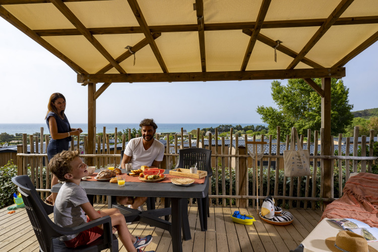 The largest option, the Privilege Caraïbes, is suitable for six people and has three bedrooms and two bathrooms. This modern accommodation offers all the comfort you need, including a spacious living room, a large terrace, and modern appliances. Every accommodation has a semi-covered terrace with table, chairs, and sun loungers, so you can make the most of the outdoors and the beautiful view.