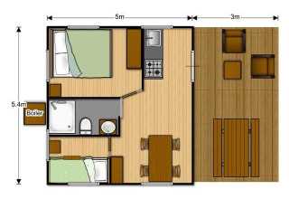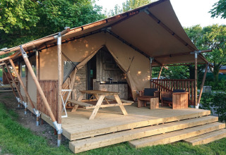 Experience the tranquility of the lake in this cozy glamping of 27 m², including a covered terrace of 15 m² facing north. The accommodation has one double bed (160x200), two single bunk beds (80x200), ideal for families. The kitchen in the living area is equipped with 4-burner stove, refrigerator, microwave, coffee maker and kettle. The bathroom has a shower, sink and toilet. Pets are welcome under conditions. Free wifi so you can easily maintain contact with the outside world, while the covered terrace invites you to relax or barbecue. A charming place to enjoy nature, water and comfort in a calm environment.