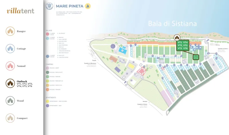 Overlooking the Bay of Sistiana, this peaceful campsite on the northern Adriatic coast combines nature, comfort, and a touch of coastal charm. Take a refreshing dip in the pool, relax in the hot tub, or watch the children play in the paddling pool. Enjoy the panoramic views from the restaurant terrace or explore the water with a kayak or paddleboard. In the mood for culture? The historic city of Trieste is just around the corner—perfect for a day trip full of stories and sights.
