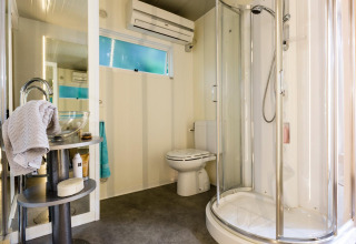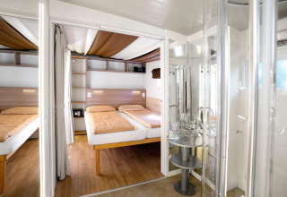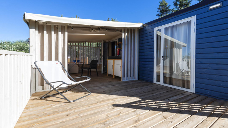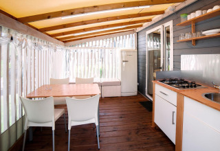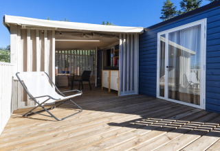 Cooking outside makes a holiday extra fun. And that's exactly why the Cottage Clever is so popular. You'll find the outdoor kitchen and the living area on the atmospheric, covered veranda. Ideal for relaxed breakfasts in the morning sun and long, cosy evenings with delicious dinners. Indoors and outdoors blend seamlessly together here. Inside, there are two comfortable bedrooms: one with a double bed and one with two single beds plus a convenient folding bed. Between the rooms is a very spacious, modern bathroom. And thanks to the air conditioning, it's always pleasant inside.