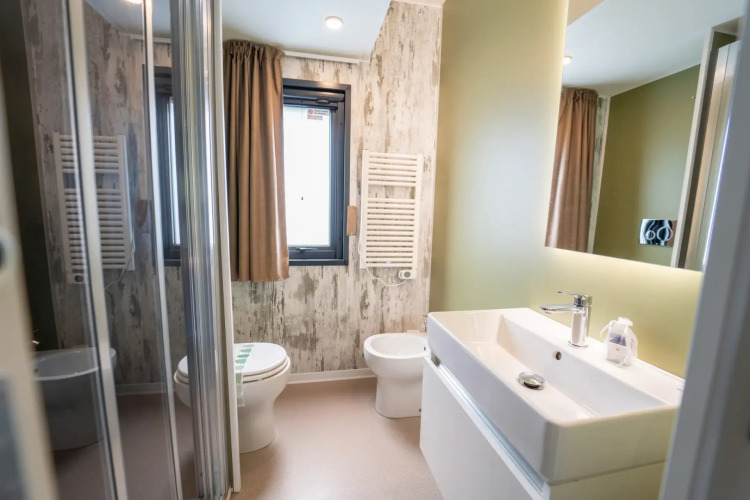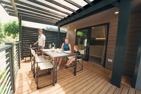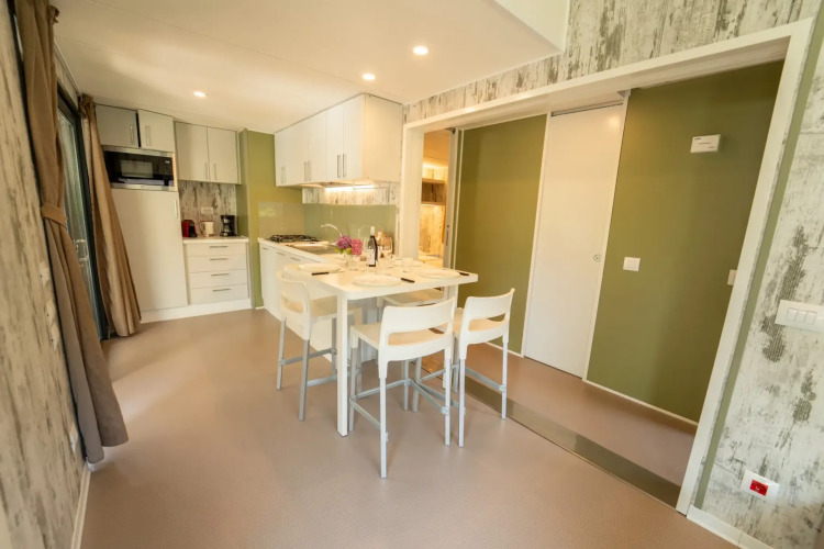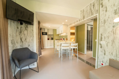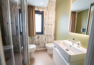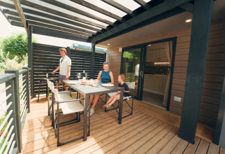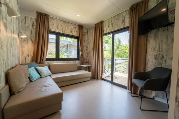 Parents can enjoy a lovely double bed, while children can settle into the two single beds or the convenient pull-out bed. The bright and spacious living room is the ideal place to relax together after a day full of adventure, and the well-equipped kitchen provides everything you need to prepare the most delicious meals together. All luxury is present, also in the bathroom, and of course air conditioning ensures that it is always pleasantly cool inside.