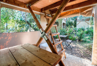 The Airstay is the ultimate hideaway for adventurous and romantic travelers seeking simplicity. Nestled in nature, this cozy two-story tent offers a pure, unplugged experience. The upper floor features a comfortable double bed, while the ground floor offers a charming relaxation area with a table.