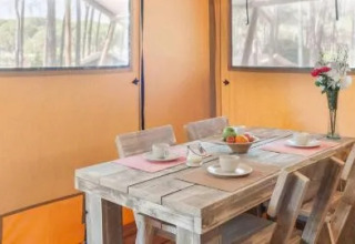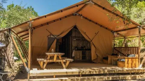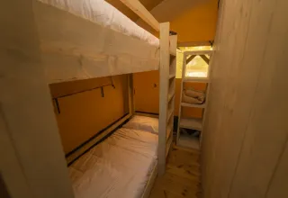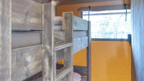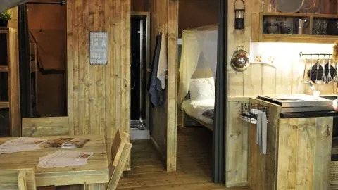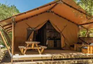 Discover the charm of the Safari Tent, an atmospheric glamping stay for families of up to four. Built from wood and canvas on a spacious wooden terrace, it blends naturally into the peaceful surroundings and delivers a true outdoor feel.
