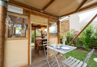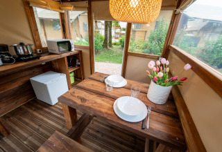 The Air Stay XL is a stylish and exclusive glamping tent, perfect for two adventurous travelers looking for a unique holiday experience in harmony with nature. Enjoy the charm of outdoor living without sacrificing comfort! This atmospheric accommodation offers two comfortable single beds, a cozy living room, and a kitchenette. Outside, a welcoming dining area awaits where you can enjoy long summer evenings. There is no air conditioning, just pure nature! Unfortunately, pets are not allowed. For extra comfort, bed and bath linen are included, and the beds are already made upon arrival.