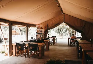 The Greencamp Safari Tent is a sturdy tent, built on a wooden platform and suitable for a comfortable stay. The tent features two bedrooms, a spacious living area, and a generous veranda where you can relax in comfort.