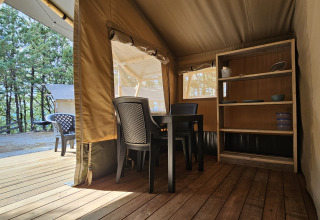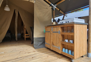 The safari tent is a luxury safari tent suitable for up to 4 people, an ideal accommodation for a family or group vacation! With an area of 25m2. Eat together at the large table with chairs, throw the front of the tent completely open and enjoy the view and fresh air even more. Prepare meals in the full kitchen and unwind at the end of the day on one of the luxurious chairs or in one of the 2 bedrooms. In one bedroom you will find a large double bed, and in the other you will find a bunk bed. With a length of 2 meters, the beds are suitable for both children and adults.