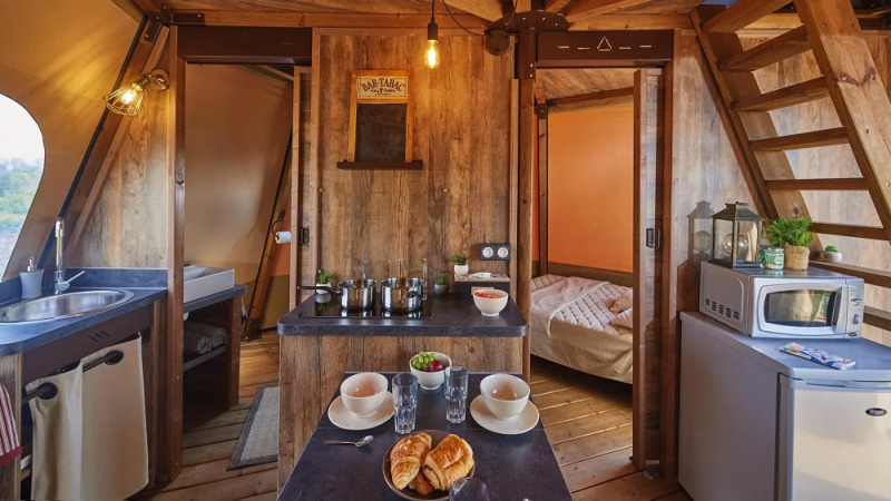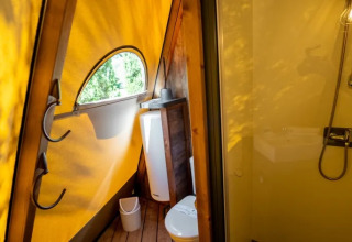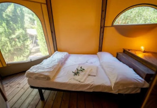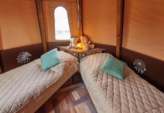 Inside, a new surprise awaits: a second floor with an atmospheric bedroom equipped with two single beds. And as if that’s not enough, outside there's also a mini safari tent ready for two adventurous sleepers. With the cozy double bedroom on the ground floor, the Tipi Lodge offers space for a total of six people. Here, it's all about pure outdoor living. The modern bathroom and fully equipped kitchen provide comfort, while nature invites you to spend as much time outside as possible. No air conditioning, no crowds, just peace, space, and togetherness.