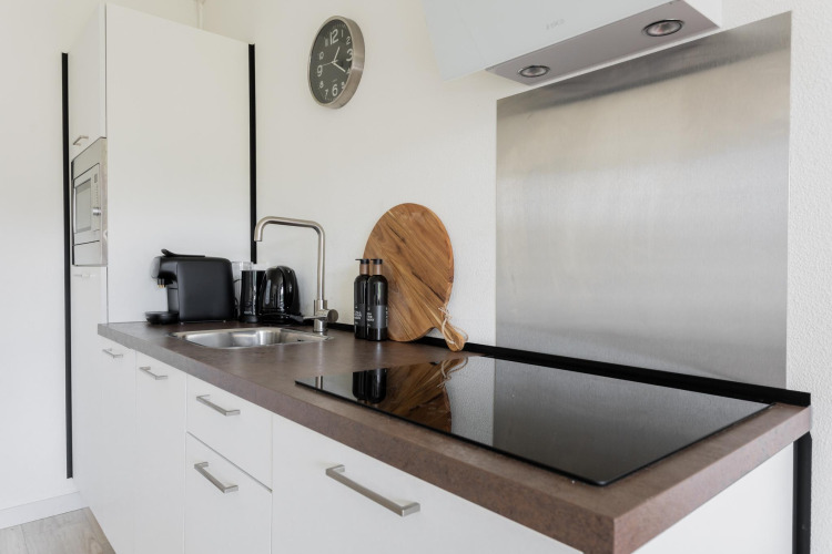 Inside you will find a cozy living room with sofa, dining area and TV. The open kitchen is fully equipped: a refrigerator, 4-burner induction hob, microwave, dishwasher, Nespresso machine, milk frother and kettle. In the modern bathroom you can enjoy a nice shower and have everything at hand. Air conditioning and heating via a heat pump ensure a pleasant climate all year round.