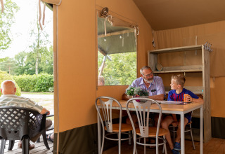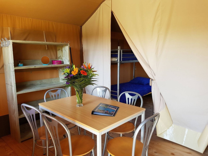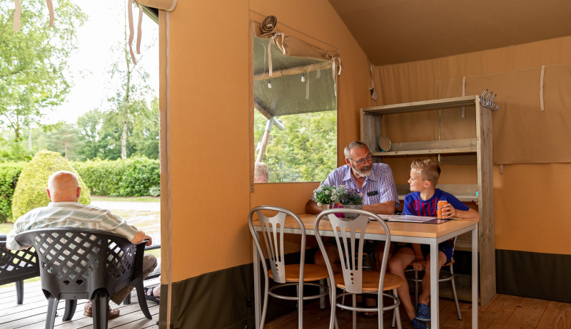 Experience luxury camping in the atmospheric Safaritenten Familieverblijf, perfect for families and groups of friends. The four tents together accommodate up to 24 people, with each tent suitable for 6 guests and featuring two bedrooms: one double bed and two bunk beds. Enjoy sociable moments in the central courtyard, while each group also enjoys its own private, sheltered spot.