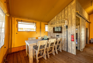 Beautiful spacious tent, spotlessly clean and very spacious. Nice quiet place near the fishing water. A warm welcome at the reception. We all enjoyed it. The pool was also nicely heated.