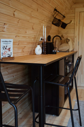 In a beautiful spot on the park, overlooking the pond from your porch, you will find the Glamping Pod. This accommodation is suitable for 2 people and has its own bathroom, a lovely Emma bed, small kitchenette and nice couch.