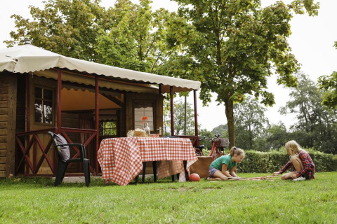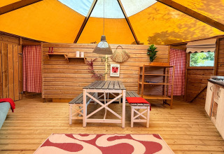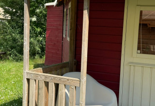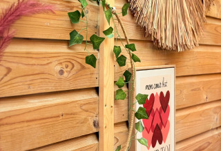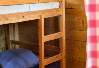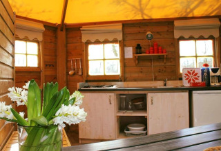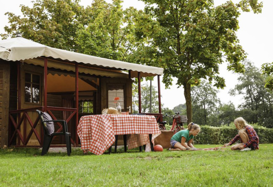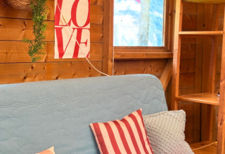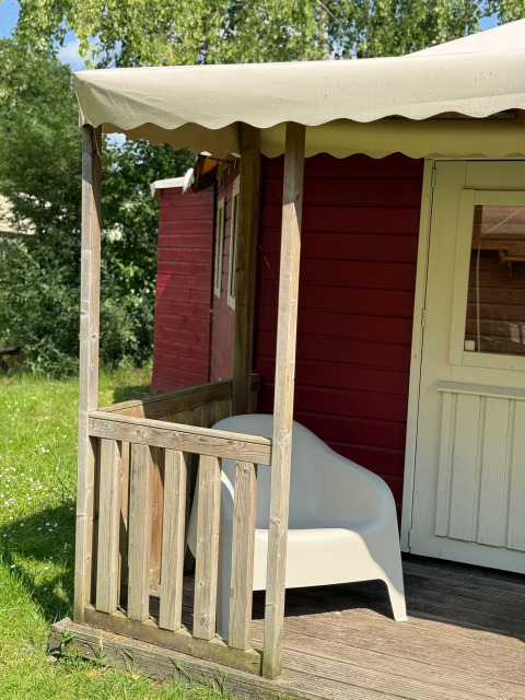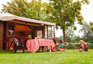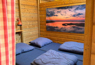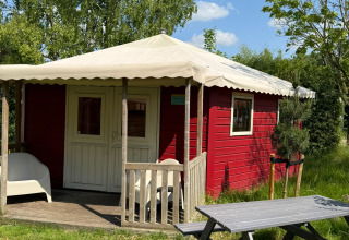 Do you see that sturdy wooden structure with a tent roof and those cheerful red accents? These are the Zweedse Huisjes at Beloofde Land. Fully prepared for you to celebrate an unforgettable vacation with up to six people. You have no less than 32 m2 at your disposal!