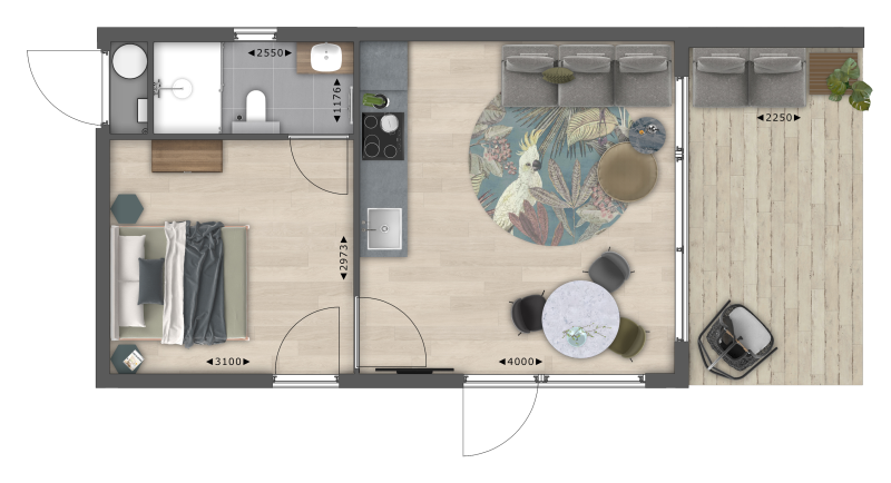 The Amalia 2, located at the edge of the forest, has a cozy living room with an open kitchen. The kitchen is fully furnished and equipped with a fridge with a freezer compartment, dishwasher, induction cooktop, oven/microwave, and a Nespresso coffee machine.