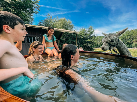 With hot tub Your wood-fired hot tub is exclusive for use during your stay and is located next to or near your canvas hideaway. Perfect for relaxing under the stars or relaxing during the day.