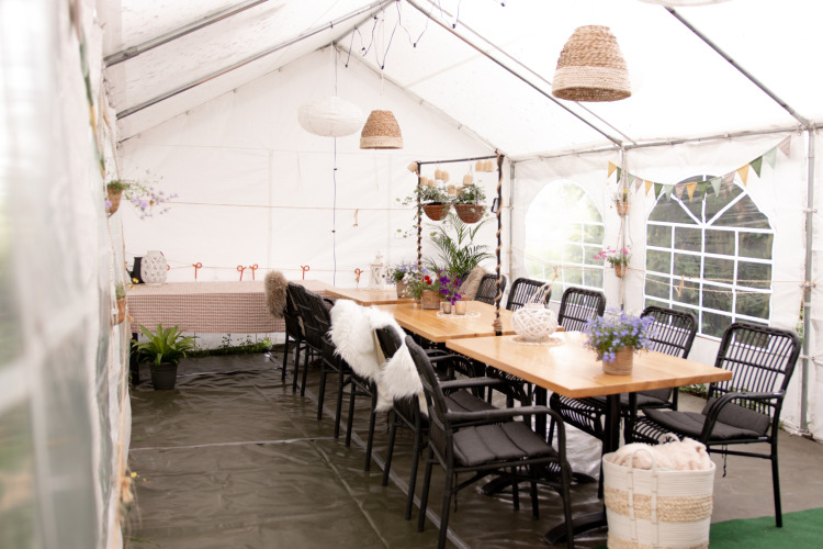 The tent house offers everything you need for a relaxing stay. Inside you will find a spacious living area with a cozy sofa and a large dining table where you can gather with the whole family or friends. Do you hesitate between inside or outside? On the veranda you'll find a lovely sheltered place under the awning, with a picnic table and lounge chairs for relaxing.