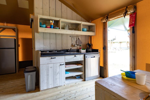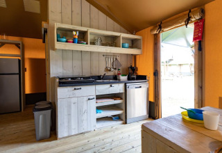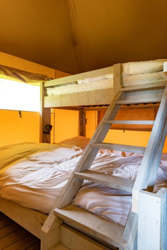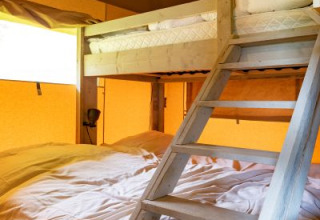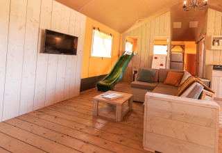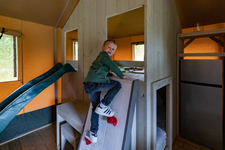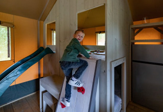 Camping with grandma and grandpa? Gramping, that's easily possible in the spacious Medley. Stay with your children in De Medley with your own slide. De Medley is suitable for 7 people and has 2 bedrooms and a box bed under the play area.