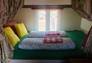 The pipowagen is best suited for 2 adults (there’s also space for 2 children if you decide to bring the family). Inside you’ll find a snug and practical interior: just what you need for a simple and relaxing glamping stay, without any unnecessary fuss. Please note: the caravan itself doesn’t have a shower or toilet. You’ll use a separate, clean washroom in the nearby farm building.