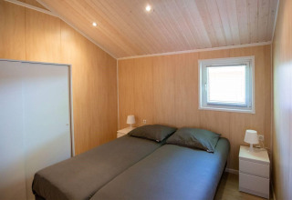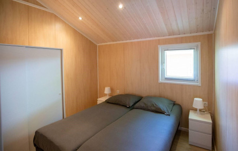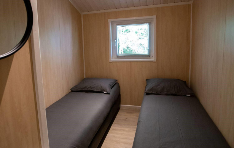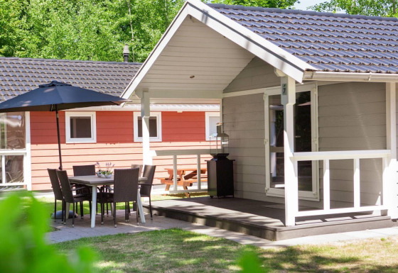 The lodge features two bedrooms with a double bed and two single beds, ideal for a comfortable stay. The bathroom is equipped with a shower, washbasin, and toilet, and towels are included. Because the lodge is all on one level, your stay feels open and accessible. Outside, you can enjoy a covered terrace with garden furniture and a parasol, surrounded by greenery.