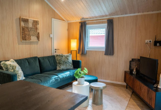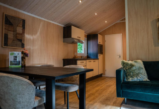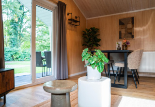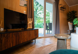 This atmospheric lodge is located on the edge of the forest and offers a fine balance between comfort and nature. Thanks to the veranda and French doors to the terrace, indoors and outdoors blend seamlessly. The warm, natural decor instantly creates a relaxed and homely atmosphere. In the living room, you’ll find a cozy sitting area and dining table, while the compact yet complete kitchen is equipped with, among other things, an induction hob, dishwasher, combi microwave, and Nespresso machine.
