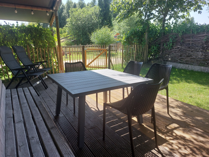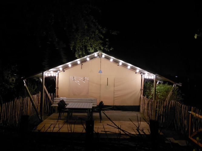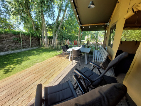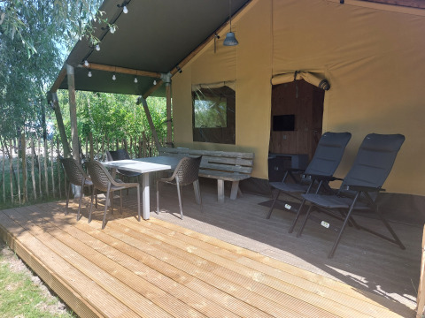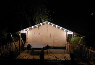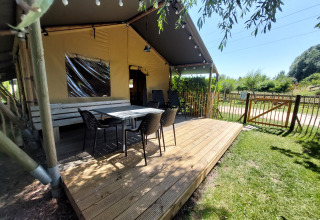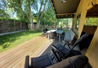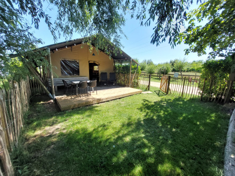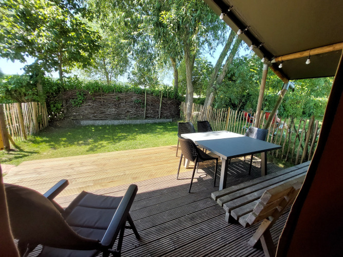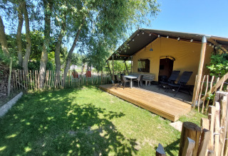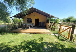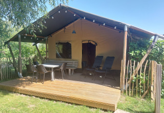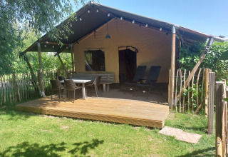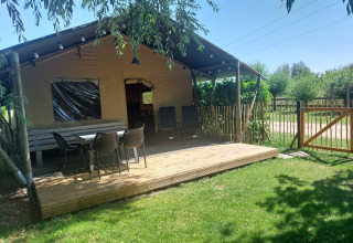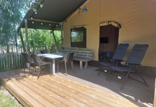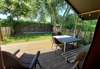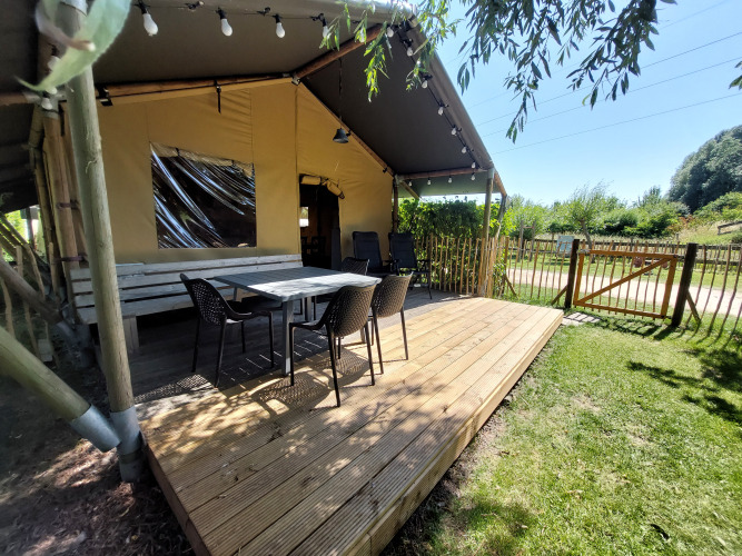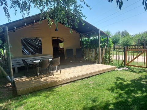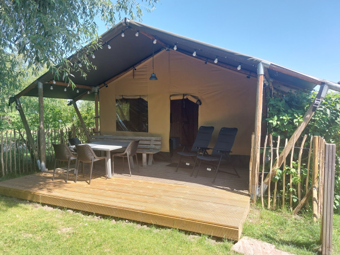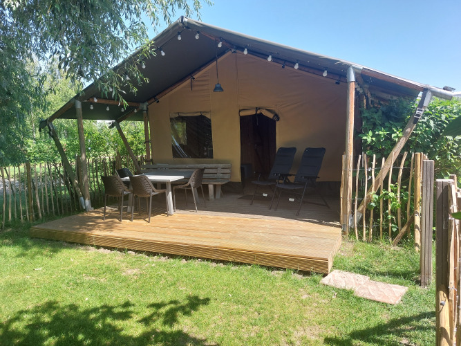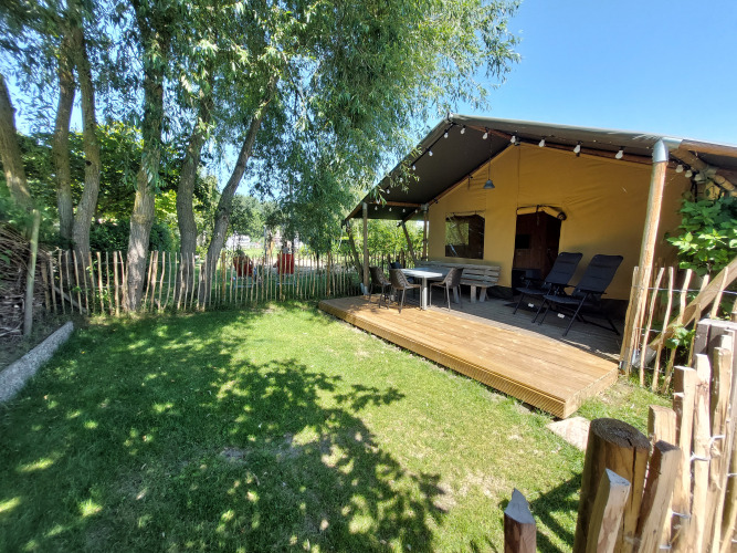 Come and enjoy the ready-made luxury safari tent Magpie. The tent is fully fenced, making it safe for children, but also ideal with pets.