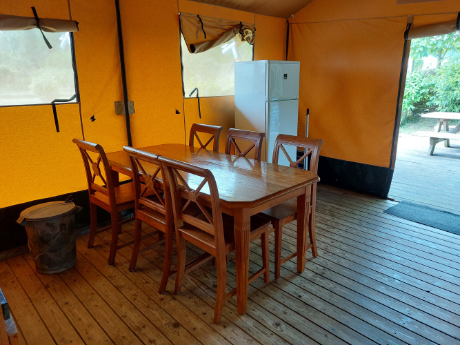 Upon entering the tent, you will see a spacious table that can seat up to 6 people. To the left is a sitting area with a sofa, a table, and a television with Digitenne.