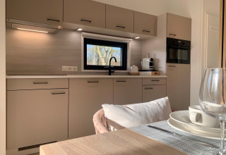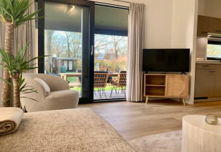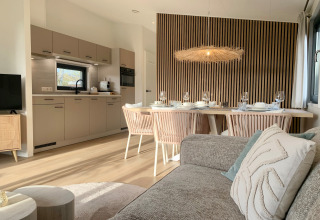 The cozy living area invites you to slow down and unwind. Sink into the large corner sofa or relax in the swivel chair while watching your favourite shows on the Smart TV, with Dutch and German channels available. From here you step straight onto the covered veranda, where you’ll find comfortable garden furniture and a private lawn of about 80 m² – ideal for playing with the kids, reading a book or enjoying long summer evenings outside.