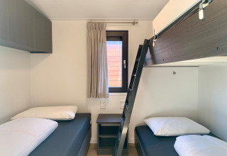 Campanula 120 has two bedrooms. The master bedroom offers a comfortable double box-spring bed with separate mattresses. The second bedroom comes with a bunk bed and a foldaway bed, making it a great room for children or extra guests. The modern bathroom features a shower cabin, illuminated mirror, washbasin and toilet. The chalet is non-smoking and pets are not allowed, which keeps it fresh, clean and allergy-friendly.